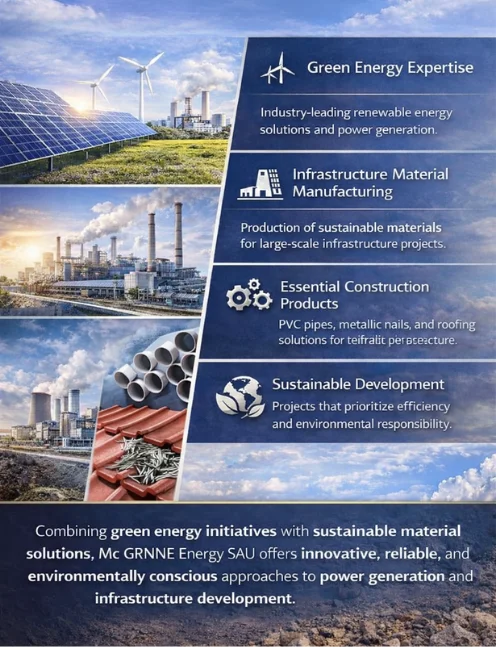 MC GRNNE ENERGY is a dynamic and forward-thinking company committed to delivering sustainable, efficient, and future-ready solutions across the green energy, construction, and infrastructure sectors. In addition to its strong expertise in renewable energy, power generation, and energy infrastructure development, the company is actively engaged in the manufacturing of essential construction products, including PVC pipes, metallic nails, and advanced roofing solutions, supporting residential, commercial, and industrial projects.